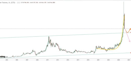 В этой связи справедливо предположение, что рост цены золота в период с 2017 г. по настоящее время — не более чем «волна роста в коридоре большого даун-тренда».